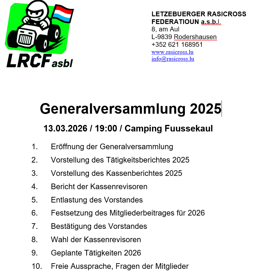 13. März: Generalversammlung LRCF Camping Fuussekaul (19:00) - Info
